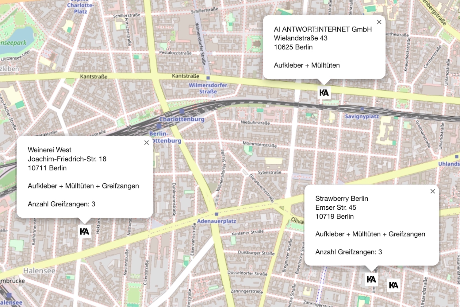 Was sind Kiezattacke Spots? Ein Ort wie beispielsweise Shops und Büros, an dem Menschen, die im öffentlichen Raum Müll sammeln möchten, Müllbeutel mit einem Kiezattacke-Aufkleber kostenlos erhalten und ggfs. Greifzangen ausleihen können. Kiezattacke baut damit eine Cleanup-Infrastruktur in Berlin auf, mit dem Ziel, 1.000 Spots für sich zu gewinnen. Diese Spots lösen ein zentrales Problem beim Cleanup – Müll zu sammeln, ganz ohne eigenes Equipment. Die Spots vereinfachen nachbarschaftliches Engagement und minimieren den Aufwand beim Wunsch, Müll zu sammeln. Ein weiterer Schritt in Richtung: Berlin regelmäßig sauber zu machen.